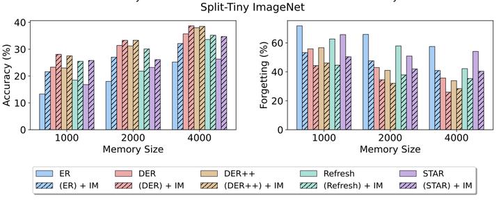 Deep neural networks suffer from catastrophic forgetting, where performance on previous tasks degrades after training on a new task. This issue arises due to the model’s tendency to overwrite previously acquired knowledge with new information. We present a novel approach to address this challenge, focusing on the intersection of memory-based methods and regularization approaches. We formulate a regularization strategy, termed Information Maximization (IM) regularizer, for memory-based continual learning methods, which is based exclusively on the expected label distribution, thus making it class-agnostic. As a consequence, IM regularizer can be directly integrated into various rehearsal-based continual learning methods, reducing forgetting and favoring faster convergence. Our empirical validation shows that, across datasets and regardless of the number of tasks, our proposed regularization strategy consistently improves baseline performance at the expense of a minimal computational overhead. The lightweight nature of IM ensures that it remains a practical and scalable solution, making it applicable to real-world continual learning scenarios where efficiency is paramount. Finally, we demonstrate the data-agnostic nature of our regularizer by applying it to video data, which presents additional challenges due to its temporal structure and higher memory requirements. Despite the significant domain gap, our experiments show that IM regularizer also improves the performance of video continual learning methods.